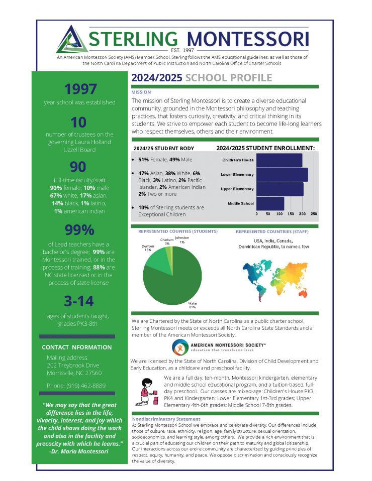 The mission of Sterling Montessori is to create a diverse educational community, grounded in the Montessori philosophy and teaching practices, that fosters curiosity, creativity, and critical thinking in its students. We strive to empower each student to become life-long learners who respect themselves, others and their environment.